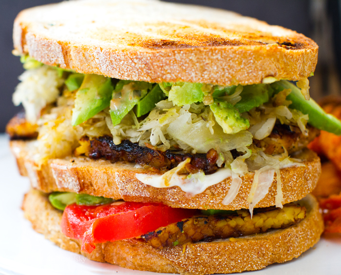 What is better than a delicious sauerkraut-stuffed, blackened tempeh infused, sassy stacked Tempeh Reuben Sandwich? How about a Tempeh Reuben Club Sandwich! This monster of a sandwich is built for two to share and tiny mouths need not apply. OK, tiny mouths are welcome, but you may need to unstack as you devour this amazingly yummy dish. Get my recipe and find out what all the buzz is about when it comes to vegan reuben sandwiches!..