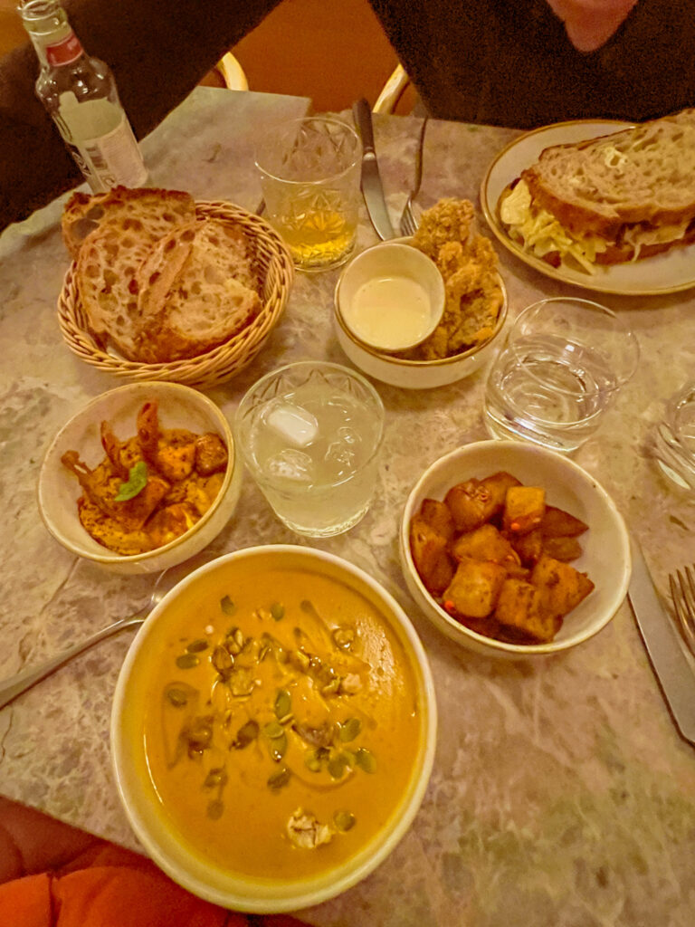 • We loved our meal: Pumpkin chestnut soup, Crispy potatoes, hummus, fiery tofu, BBQ mushroom sandwich, affogato dessert.