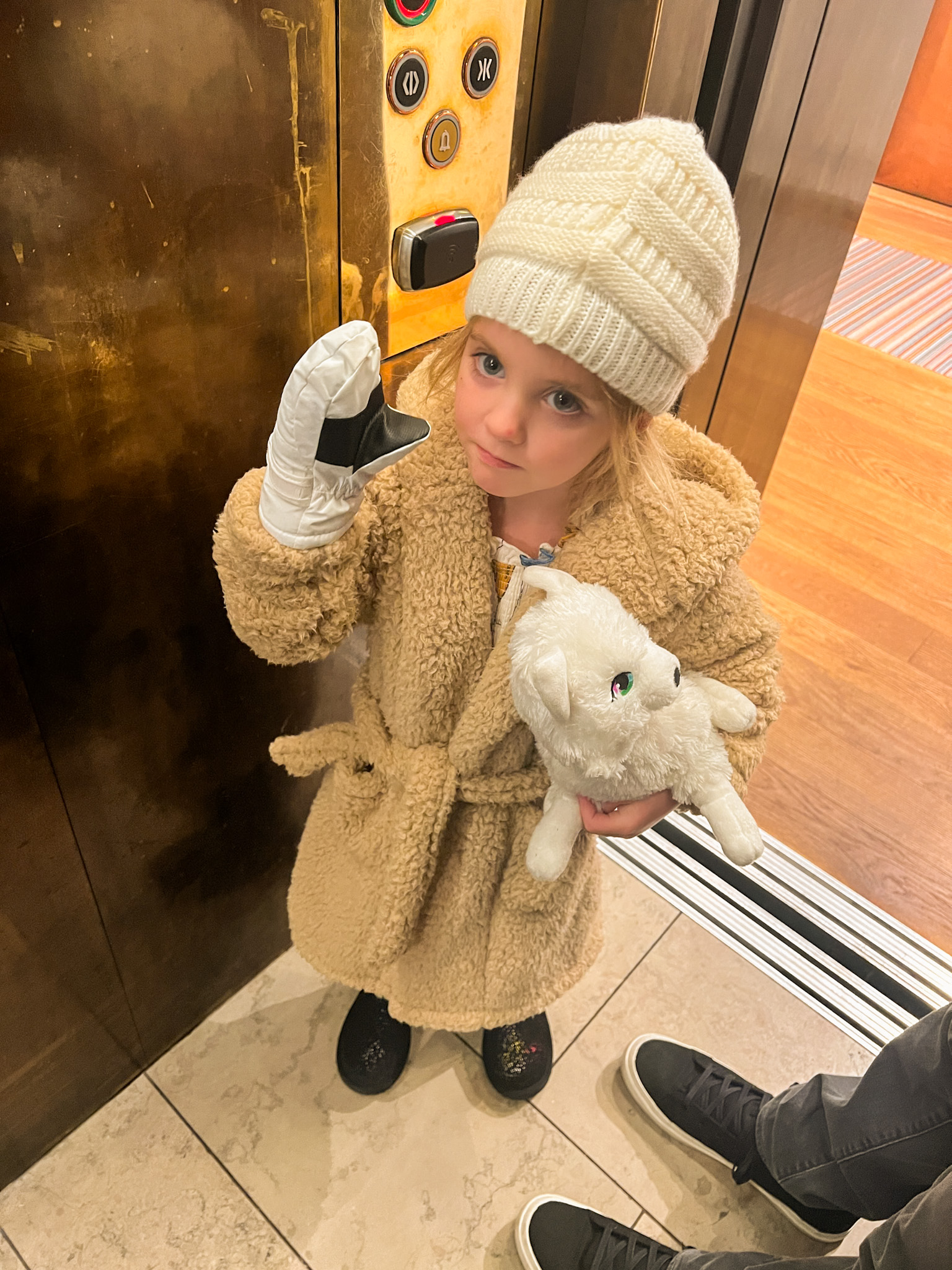 Heads up: Jet lag was real, we never sleep well the first night and do an early breakfast - Rosalie dressed in one glove, a snow hat, a robe, and her stuffed animal.