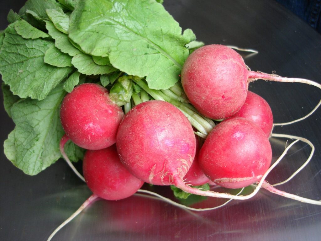 cherries with the stem attached, some peaches with the leaves still attached, corn in the husk, sprouts still in their rooted bed, radishes and carrots with the stalks still attached, pineapples with healthy stalks, tomatoes on the vine, strawberries with long stems and leaves still attached and even hydroponic boston lettuce with the roots still attached.