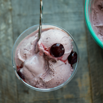 - To assemble: Pour the base into an ice cream maker and churn for 25 minutes or until thick but not frozen solid. In the meantime, prepare a 9 x 5 x 3-inch (23 x 13 x 7.5 cm) loaf pan by lining it with parchment paper. When the ice cream base is ready, take the cherry sauce out of the refrigerator. Begin filling the loaf pan, alternating layers of the base and the cherry sauce and making 4 layers of the base and 3 thinner layers of sauce. Drag a butter knife through the mixtures to create swirls. Place the ice cream in the freezer for 1 to 2 hours. When you are ready to serve, take the ice cream out and let soften for 5 to 10 minutes before scooping, if necessary. Garnish with fresh cherry pieces, if using, and servein small bowls.
