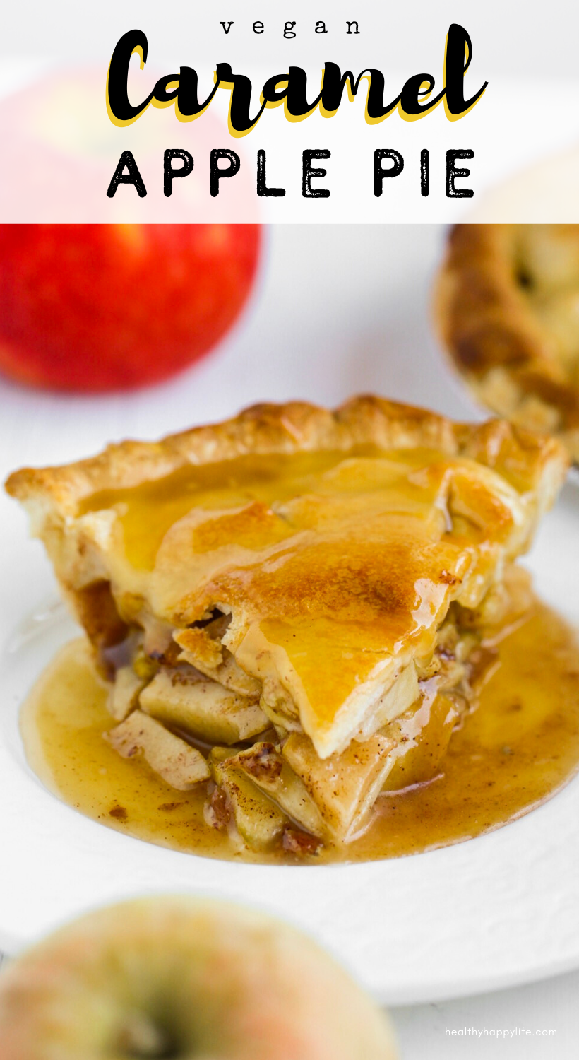 This vegan Caramel Apple Pie is stuffed with not-to-mushy, thinly sliced, cinnamon apples. It has a buttery flaky crust that is baked to a golden brown, but not overbaked, then everything is drenched in a sticky-sweet apple cider caramel sauce. And there. I love apple pie.