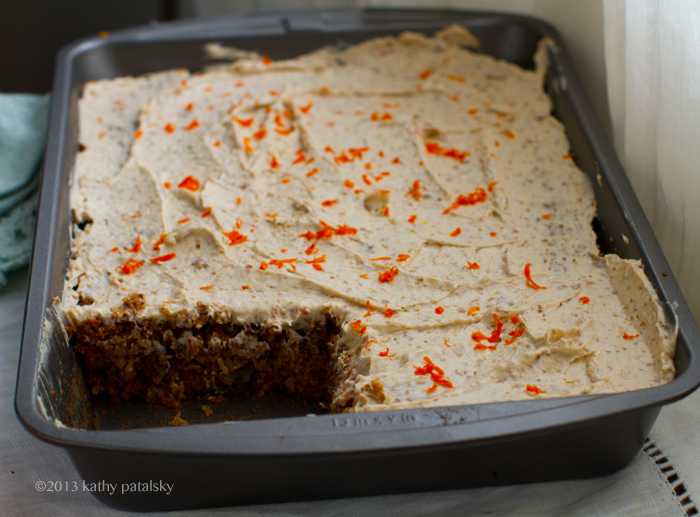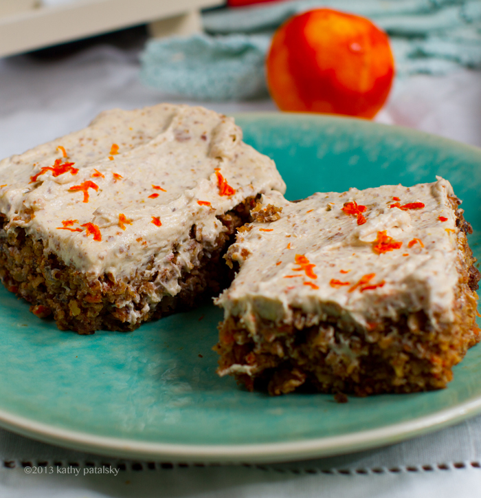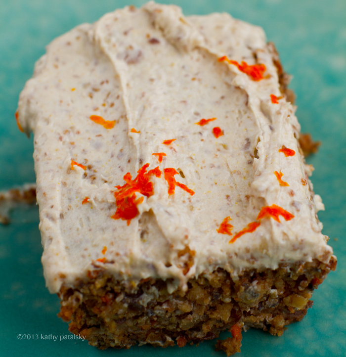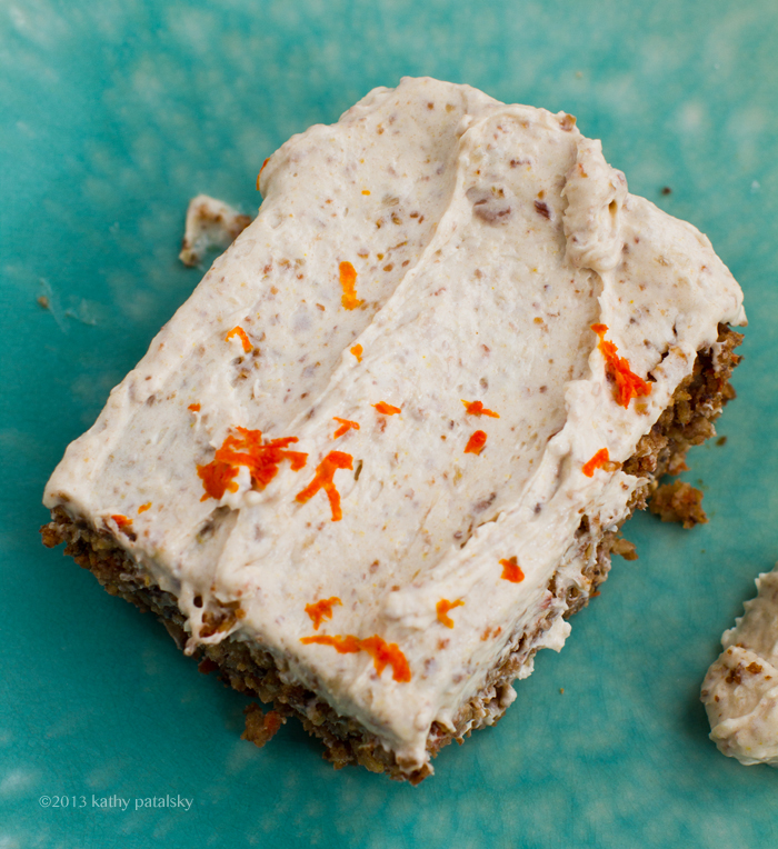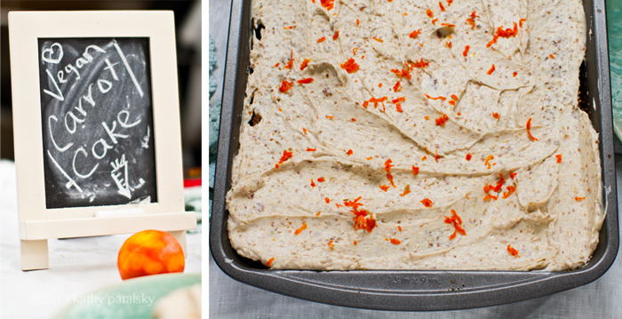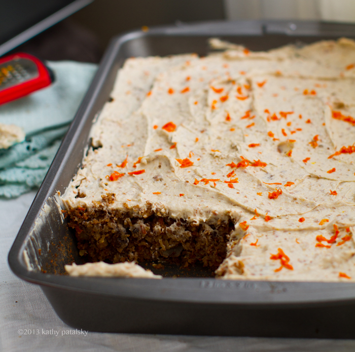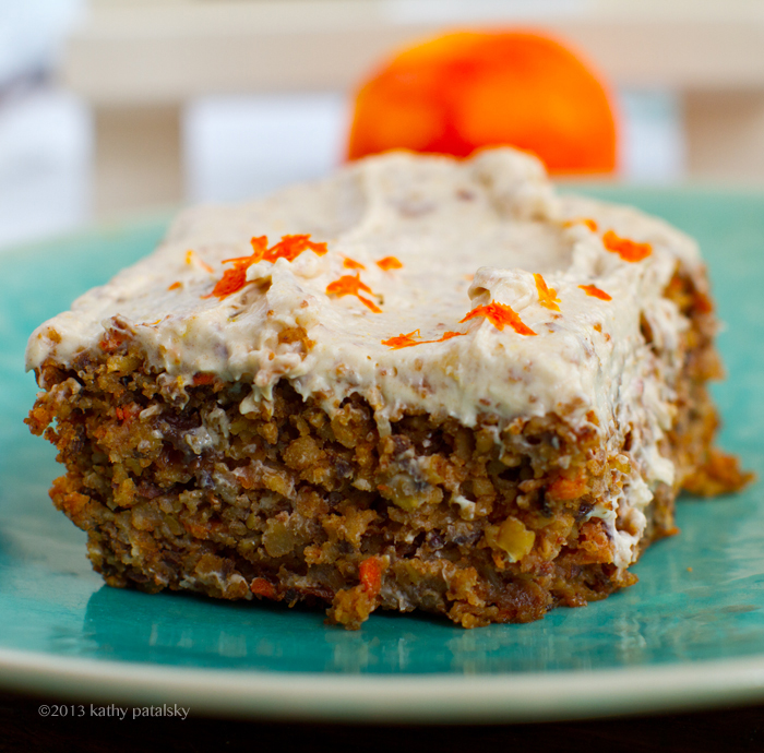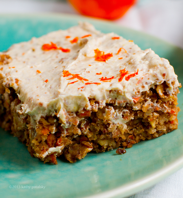 Flavors. Nutty walnuts, thick bits of sweet carrot, spices, orange zest, tender sweet organic raisins and that cream cheese frosting on top is everything you want from a carrot cake frosting .. minus the animal products. Try my recipe and you will be enjoying this healthy-delicious, easy carrot cake in a flash!..