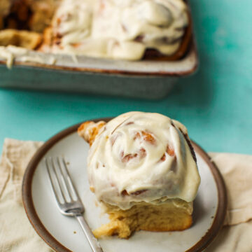 I personally like both frosting options! My Pumpkin Cinnamon Rolls showcase a thicker style of frosting than these more glazed rolls.