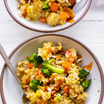 This Vegan Egg Fried Rice is a simple and nourishing one bowl entree. Loaded with veggies, plant-based protein and fiber -- and flavor -- this bowl is a meal you can whip up in under thirty minutes.