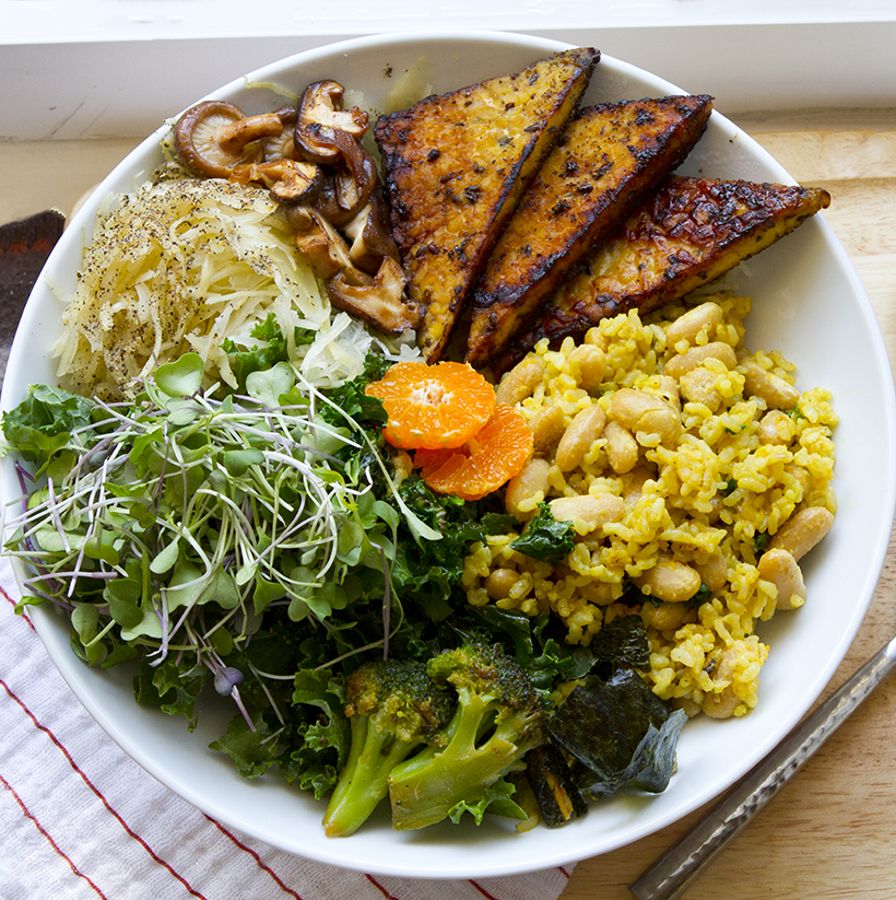 This meal in a bowl includes tempeh, sauerkraut, shiitakes, rice and veggies. This is a casual take on a macrobiotic meal.
