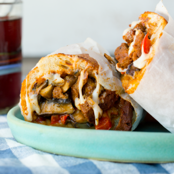 The Bread? My husband loves a sourdough hoagie-style roll. I actually scoop out some of the bread filling so that there is less white flour bread and more delicious filling. Other bread options include: baguette, pita bread, hamburger buns, hot dog buns, plain old sliced bread (thicker versions work better!), flatbread or even a large wrap for a Philly Cheese Wrap! Heck, I bet you could even use collard leaves for a healthy grain-free spin!