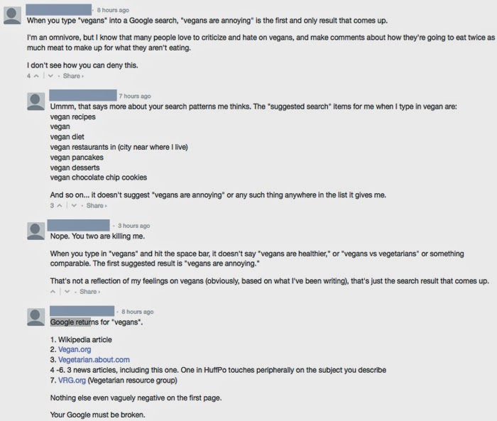 After I listened to the audio, I started reading the webpage comments and was shocked to read such negative replies after such a rockstar, easy-going interview .. and on NPR. I would expect as much on say, BuzzFeed or even YouTube. But NPR? One of the oddest comments was how someone insisted that vegans are annoying. Why? Well his google search suggestions confirmed it for him. Well OK then. I was so mind-boggled that people are STILL so discriminatory towards vegans, calling them (me) annoying, that I decided to comment back here on my blog.