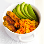 Begin plating your meal. Add the warm mac and cheese to a bowl. Place the tempeh around the edges and add a fan of the avocado slices. Drizzle a generous amount of hot sauce over top. Serve warm.