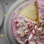 This minty vanilla layer cake is a candy cane-inspired dessert for Christmas. Vegan and topped with a fluffy cream cheese frosting. Plant-based coloring.