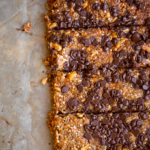 Pull the bars from the oven and sprinkle the optional chocolate chips over top. Then, fold the parchment back over and gently press the chocolate into the baked bars. They should melt and smash into the top of the bars quite effortlessly.