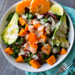 Assemble Salad. Add the kale mixture to your serving bowls. Followed by the avocado fans. Dice the cooled, but still warm sweet potato and add in generous piles to the salad. Sprinkle hemp seeds over top. Add the citrus to the side of the salad. Then drizzle as much additional dressing as you want over top the salad. You can also add additional hemp seeds if desired. Serve with lemon slices. I like to serve with some toasted bread and make DIY avocado toast as I eat the salad. Also optional: sprinkle smoky paprika and nutritional yeast over top to serve.