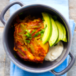 Whip up your easy enchilada sauce. Recipe here. Or you could use store bought. Start layering your casserole. Tear the corn tortillas in half, and layer them so that the long edge goes along the edge of the dish. Add four halves to each layer, as shown in a photo in this post. Then add your beans, smooth them out. Top the beans with a layer of tortillas (4 halves a gain). Next add the spinach and another layer of tortillas. finally, add a layer of rice, another layer of tortillas, the red enchilada sauce, optional cheese and the hatch chiles on top.