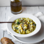 Remove lid and add more water or broth as desired for a good brothy consistency. Also add in all the remaining ingredients: beans, pesto, nutritional yeast, pepper flakes or cayenne, spinach and a few pinches of vegan Parm. Stir well and cover again with lid. Keep heat on low and simmer for about 2-5 minutes.