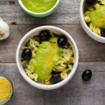 Toss the pasta with the pesto and add to serving bowls. Garnish each bowl with 4-5 olives and 1 teaspoon nutritional yeast on top.