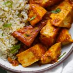 Warm a skillet over high heat. Add in the extra virgin olive oil, followed by the tofu. Cook the tofu for about five minutes, flipping it around about midway through. You want the tofu browned, but not over cooked. Crispy edges and a bit of color is what you are going for. Turn heat off while you warm the curry sauce.