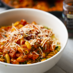Serve over top pasta. Add vegan cheese and red pepper flakes over top.