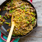 When pasta is cooked through, drain and add to skillet. Also add in the pesto sauce. Using some tongs, stir the pesto into the pasta right in the pan. Add the nutritional yeast too. Stir everything together. Turn the heat up to high for a good minute to really let the flavors mingle and the pasta absorb all the flavor from the sauce and veggies.