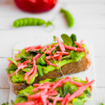 Slather 2-3 tablespoon of the pea-avocado spread onto each slice of bread - add a generous amount for a think layer of spread. Then top with as many pickled radishes and fresh sprouts as you'd like. Finish with some fresh black pepper on top. If desired, you can add a pinch of fleur de sel or another coarse sea salt on top to serve. Slice and serve the toasts. Best served same day.