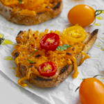 Place the tray under the broiler for about 2-4 minutes. Watch closely so as to not burn the toast or over-cook the cheese. It should be melty and lightly browned, a bit bubbly when done.