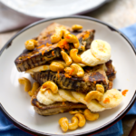 Cashews: Add the cashews and agave, coconut or maple syrup to the pan, keep the skillet at medium heat and shake the pan a bit. Toast the cashews with the syrup for a minute. Remove from heat and pour over top the french toast on the plates. As the cashews cool they will candy a bit.
