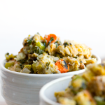 Slowly fold in the bread and broth, alternating by adding in 1-2 cups of bread, tossing with the veggies, adding a splash of broth and repeating until all the bread and broth is added. Cover with lid and cook over low heat for about five minutes. During this time, preheat your oven to 350 degrees.